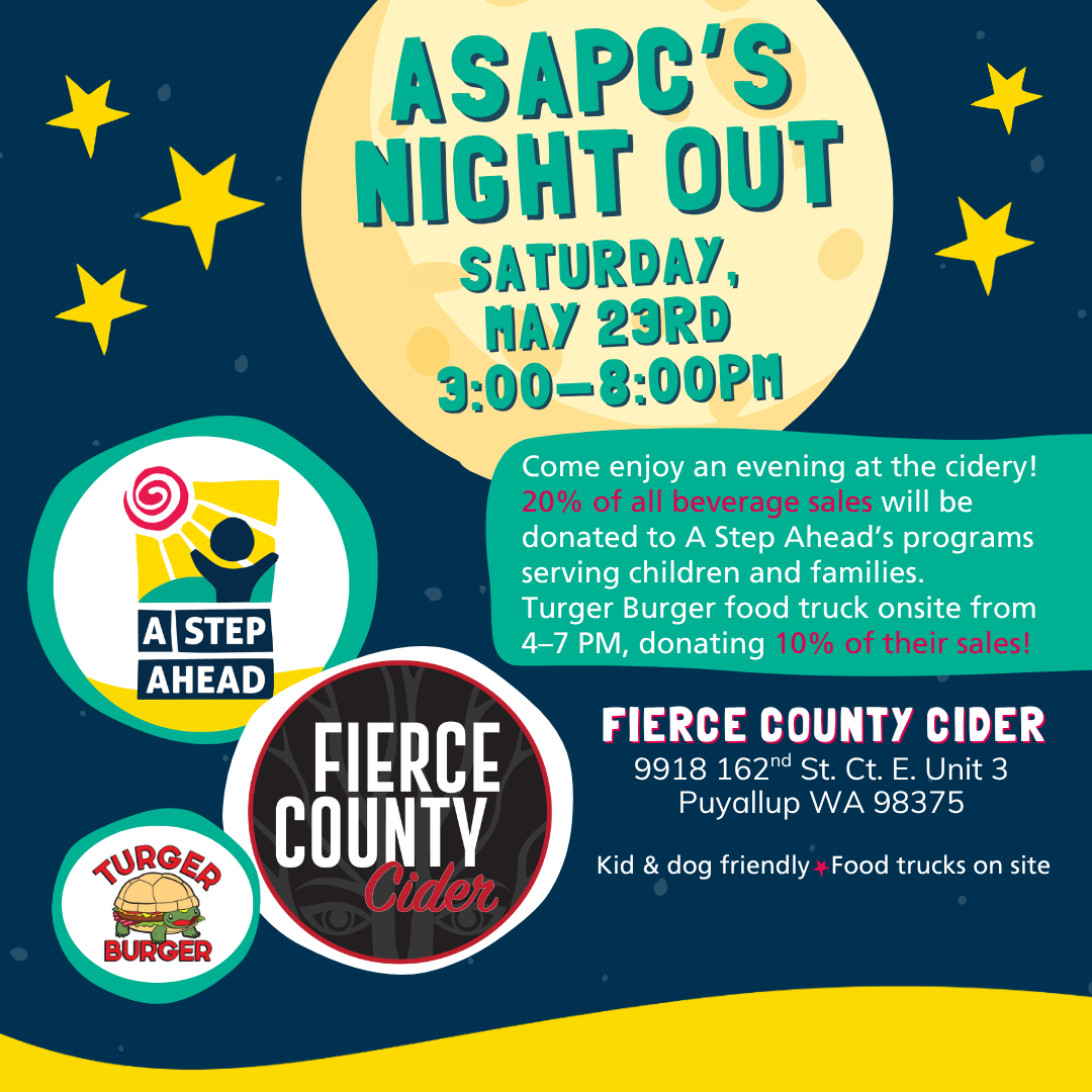 Come and enjoy an evening at the cidery! 20% of all beverage sales will be donated to A Step Ahead’s programs serving children and families in Pierce County!
